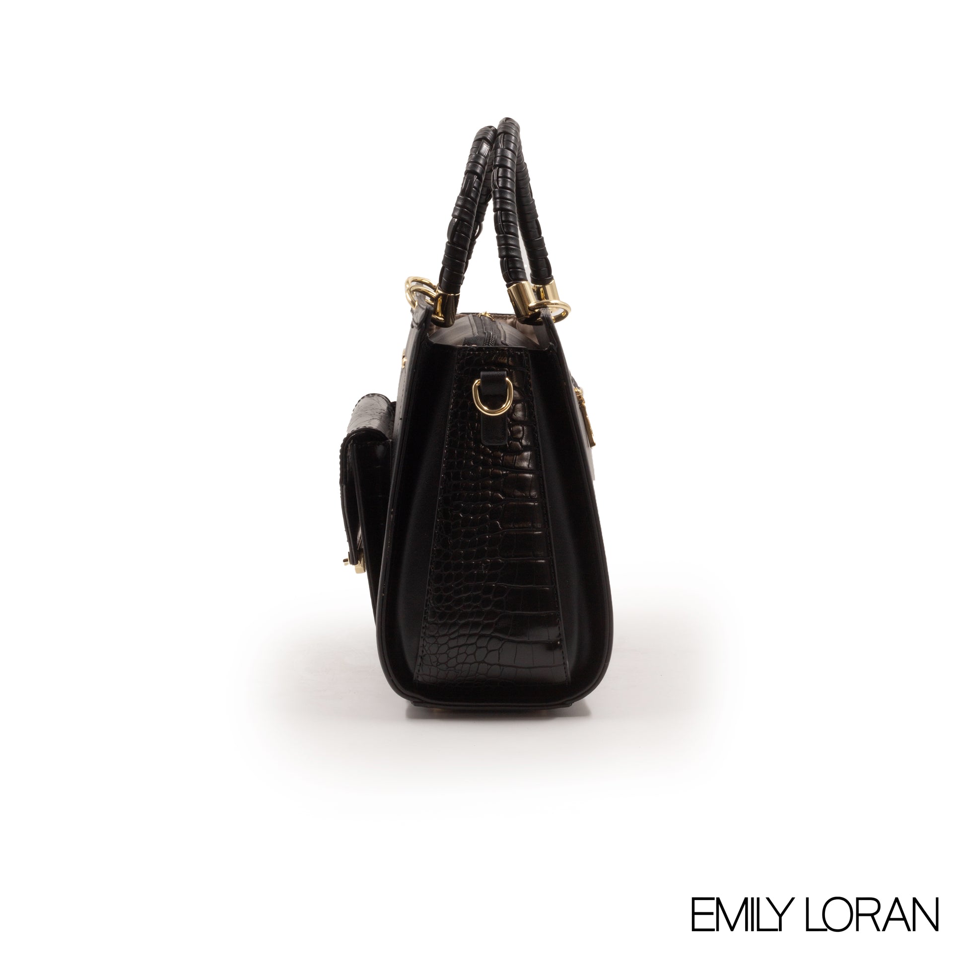 BLACK LEATHER HANDBAG WITH CROC ACCENT -LARGE