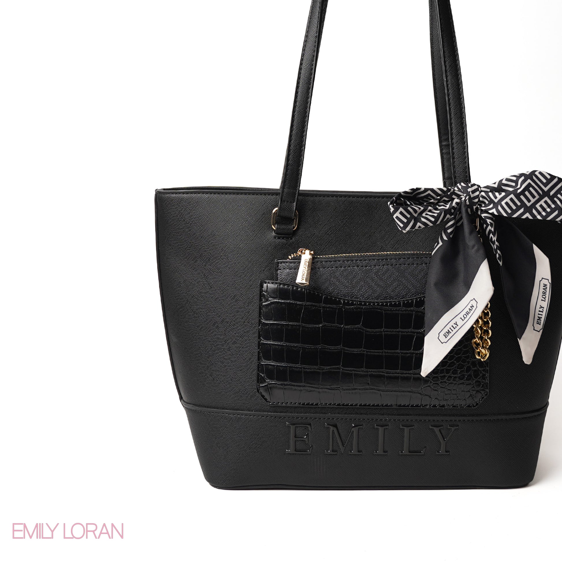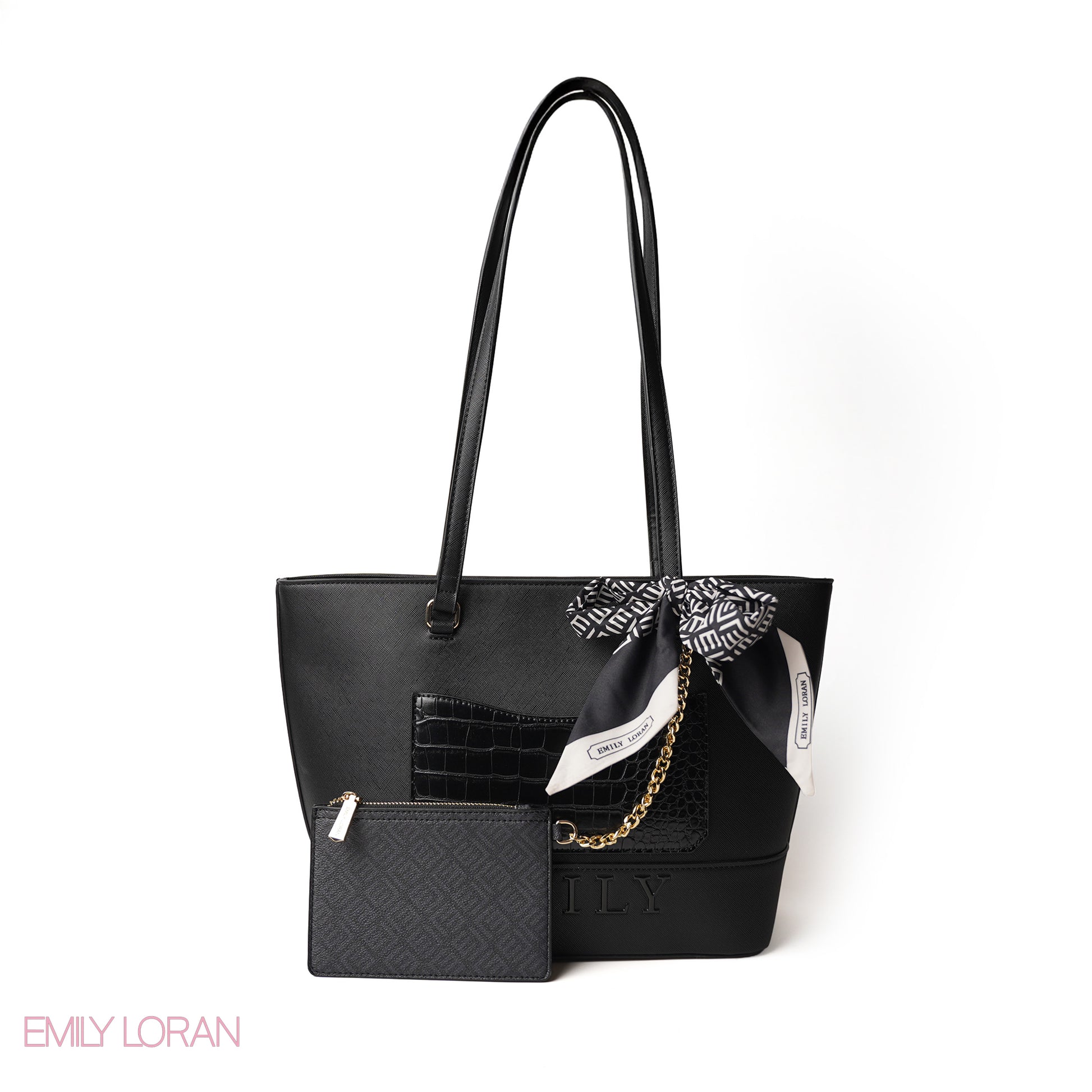 BLACK LEATHER SHOULDERS BAG WITH LOGO EMILY ACCENT, SCARF - LARGE