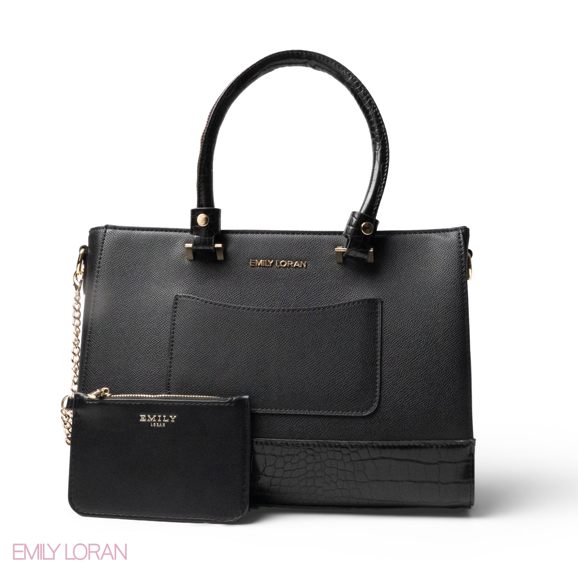 BLACK LEATHER SMOOTH HANDBAG WITH CROC DETAILS -LARGE