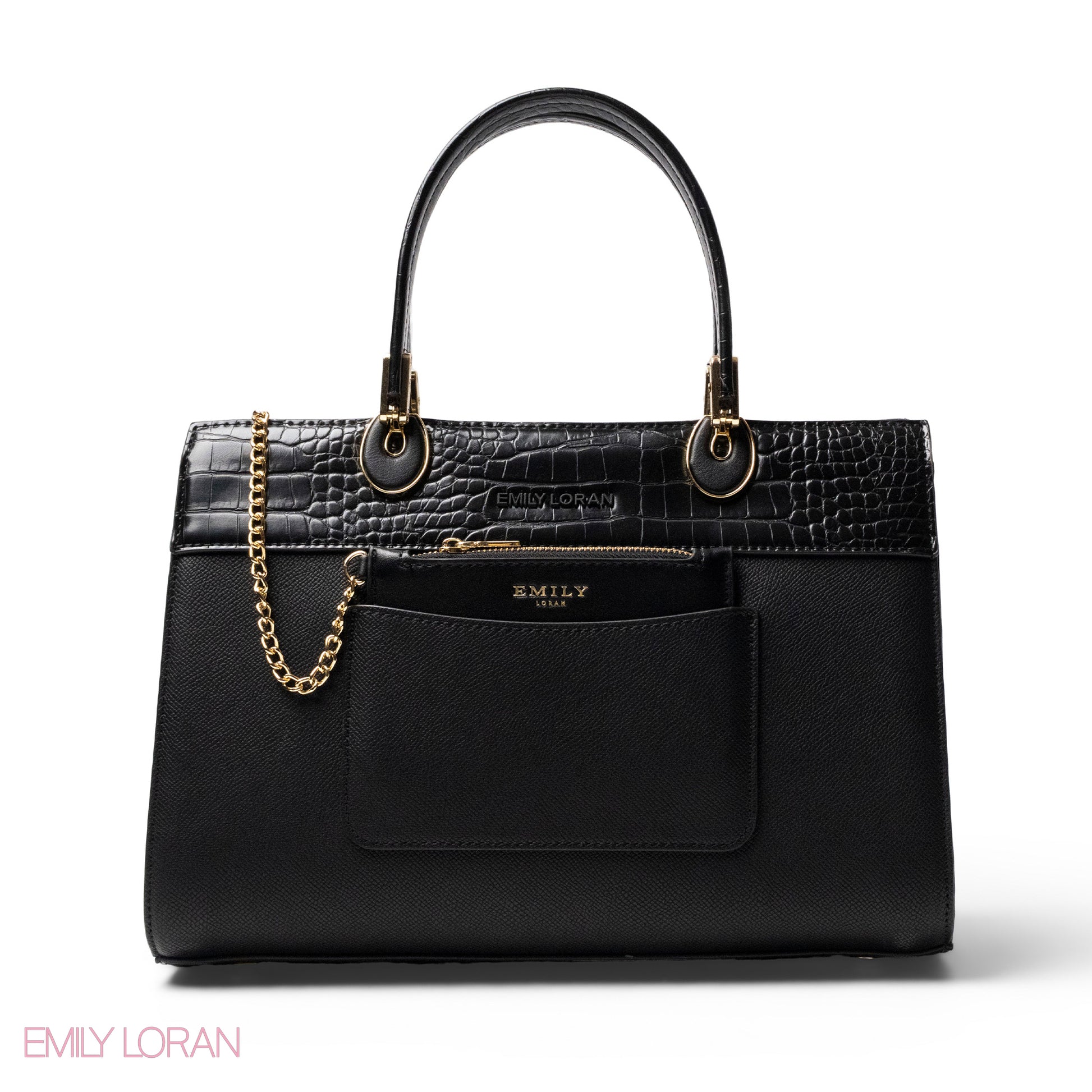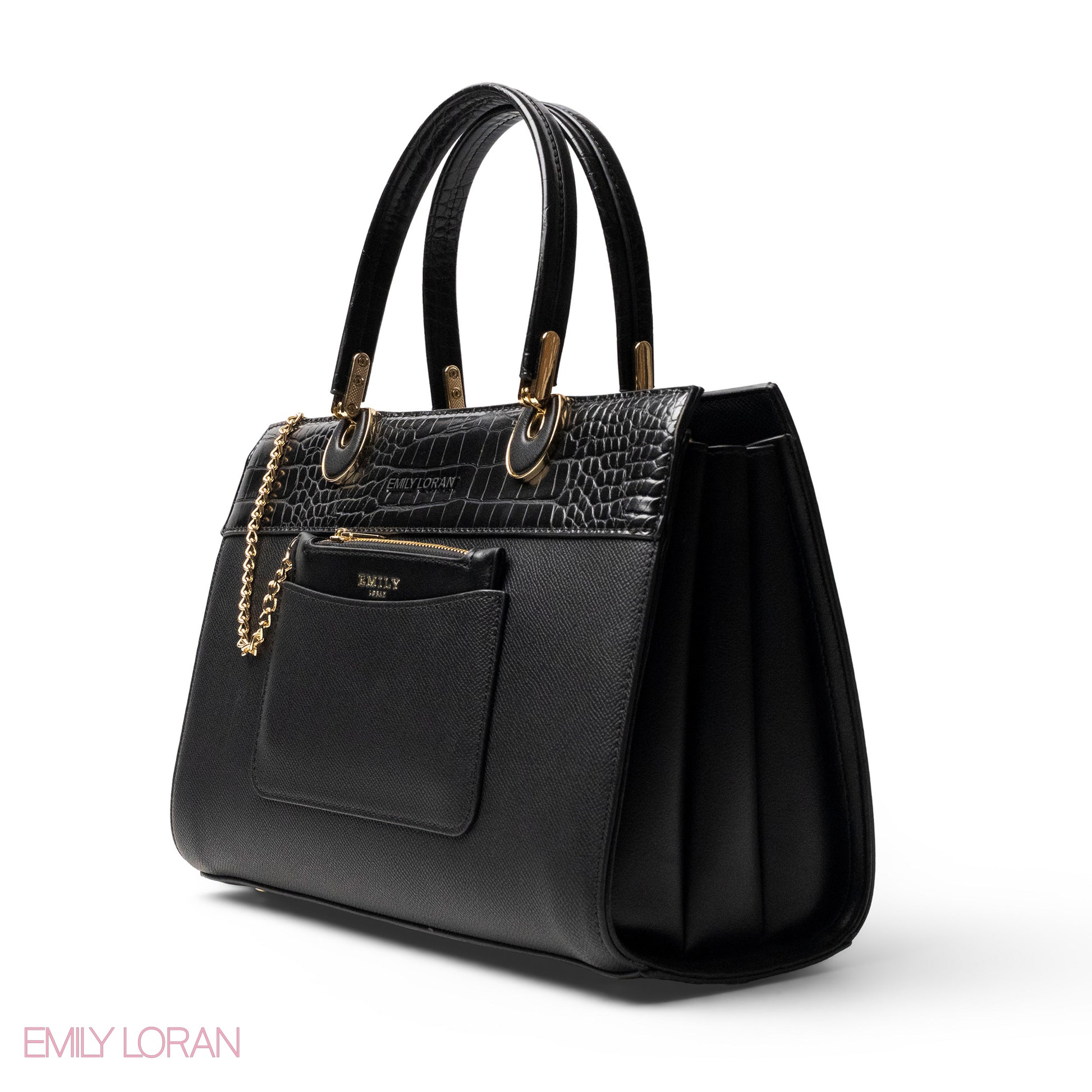 BLACK LEATHER SMOOTH HANDBAG WITH CROC DETAILS-LARGE