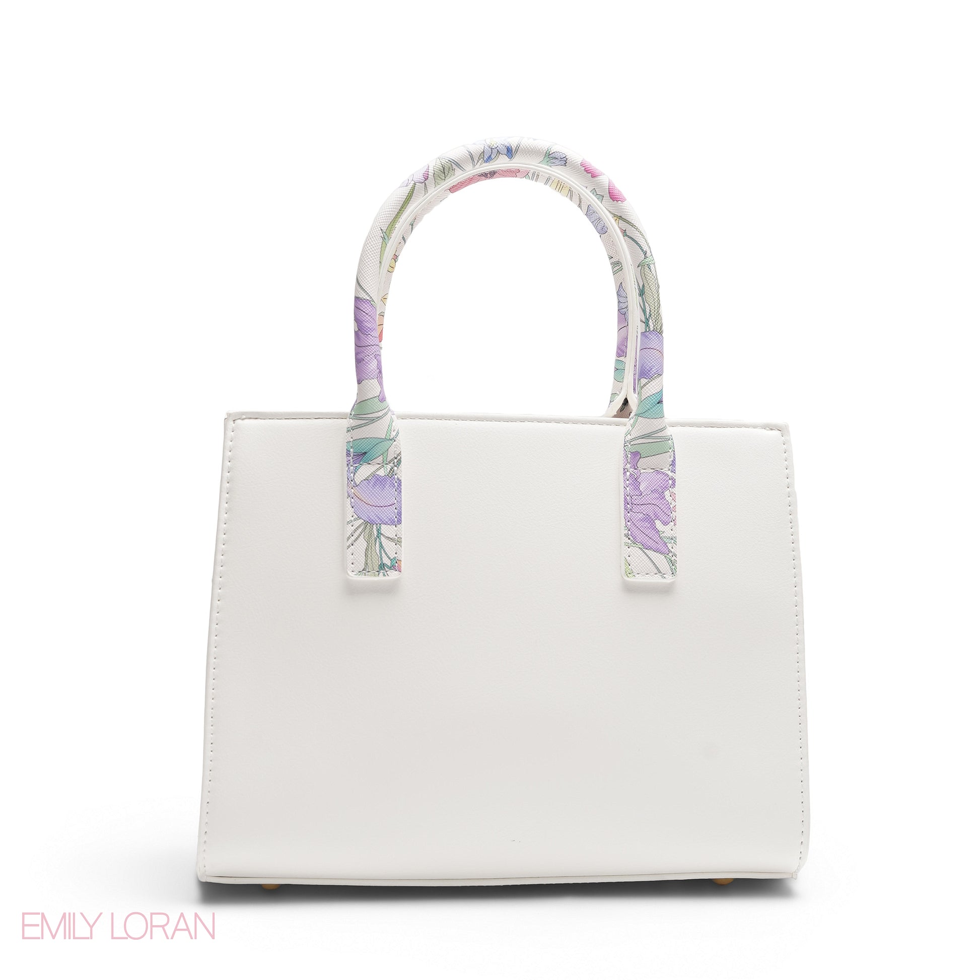 WHITE EMILY FLORAL ACCENT TOTE BAG WITH LOGO STRAP - MED