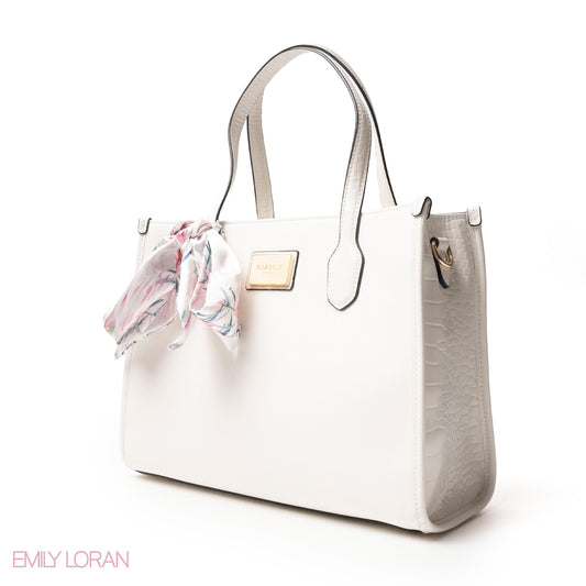 WHITE SMOOTH LEATHER HANDBAG WITH FLORAL PRINT SCARF - LARGE