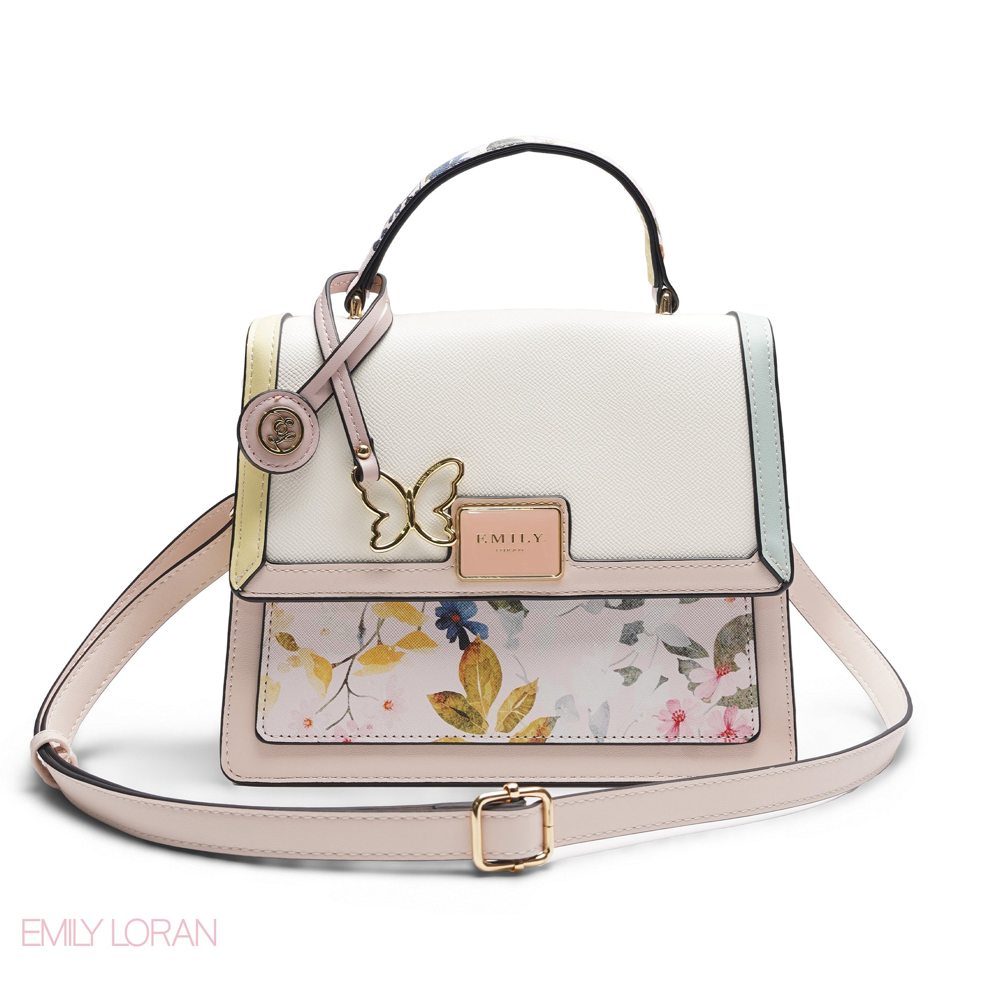 EMILY MULTI-COLOUR PASTEL FLORAL SATCHEL BAG WITH BUTTERFLY CHARM - MED